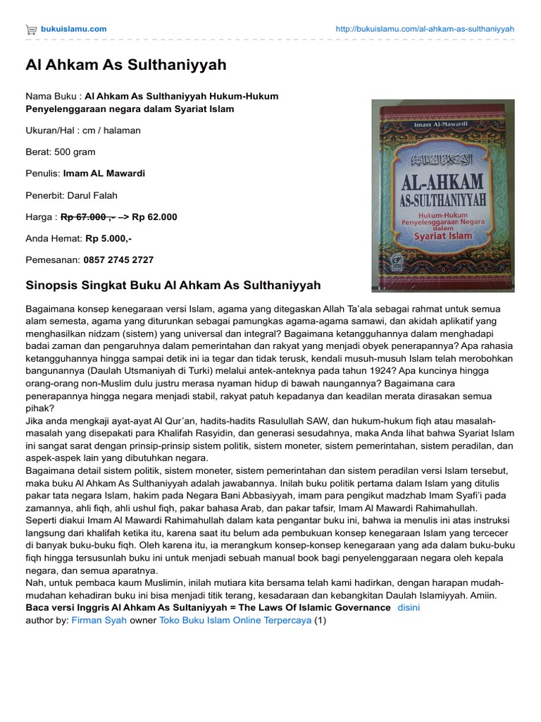 Are you looking for something related to Terjemahan Kitab Al Ahkam Al Sulthaniyyah ? Congrats you come to the right places. In this post i will share you about Terjemahan Kitab Al Ahkam Al Sulthaniyyah , not only the Images but also the PDF file related to Terjemahan Kitab Al Ahkam Al Sulthaniyyah
