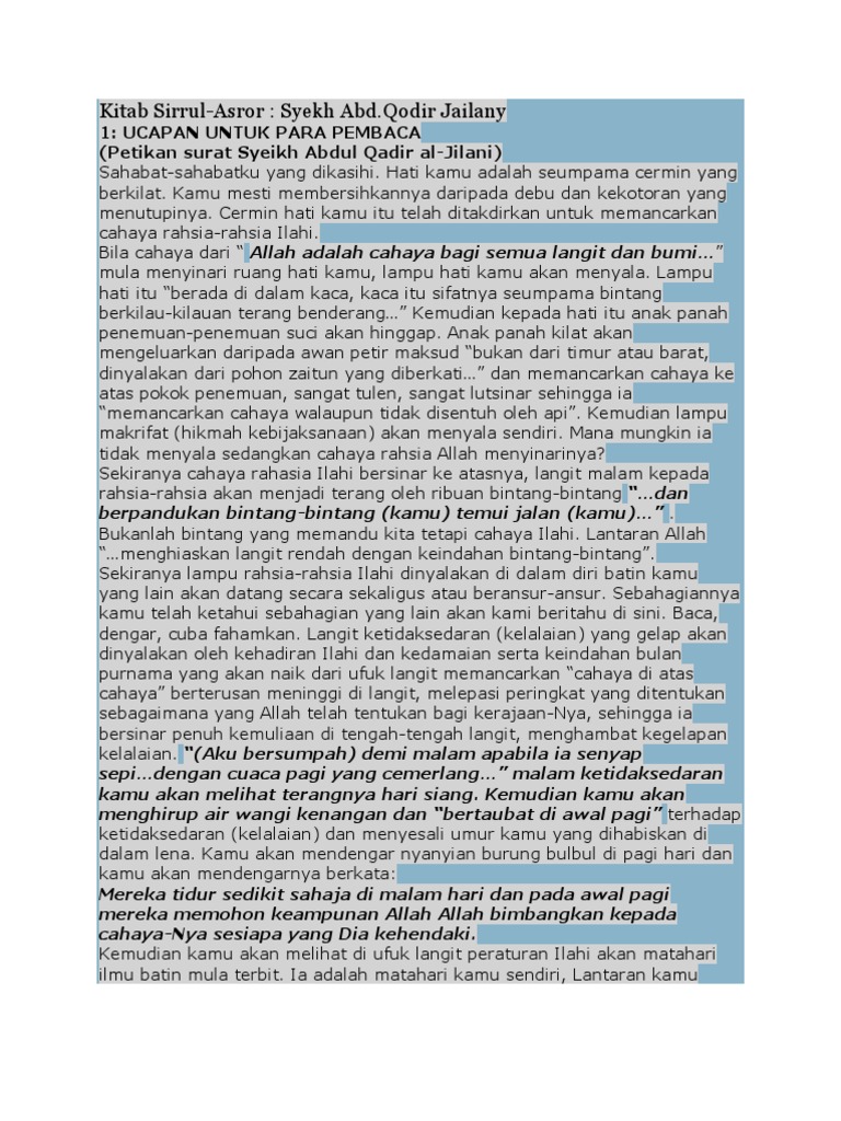 January 4th, 2021 - Download Terjemah Kitab Sirr al Asrar Karya Seikh Abdul Qadir Zaelani Kitab sirr al asrar ini merupakan karya dari sang sultonul aulia wali qutub pendiri tarekat qodiriah Pada kitab rahasia di balik r PDF KITAB SIRRUL ASROR Muhammad Sanusi Rizal Al January 5th, 2021 - KITAB SIRRUL ASROR KITAB SIRRUL ASROR BAB 1 Semoga